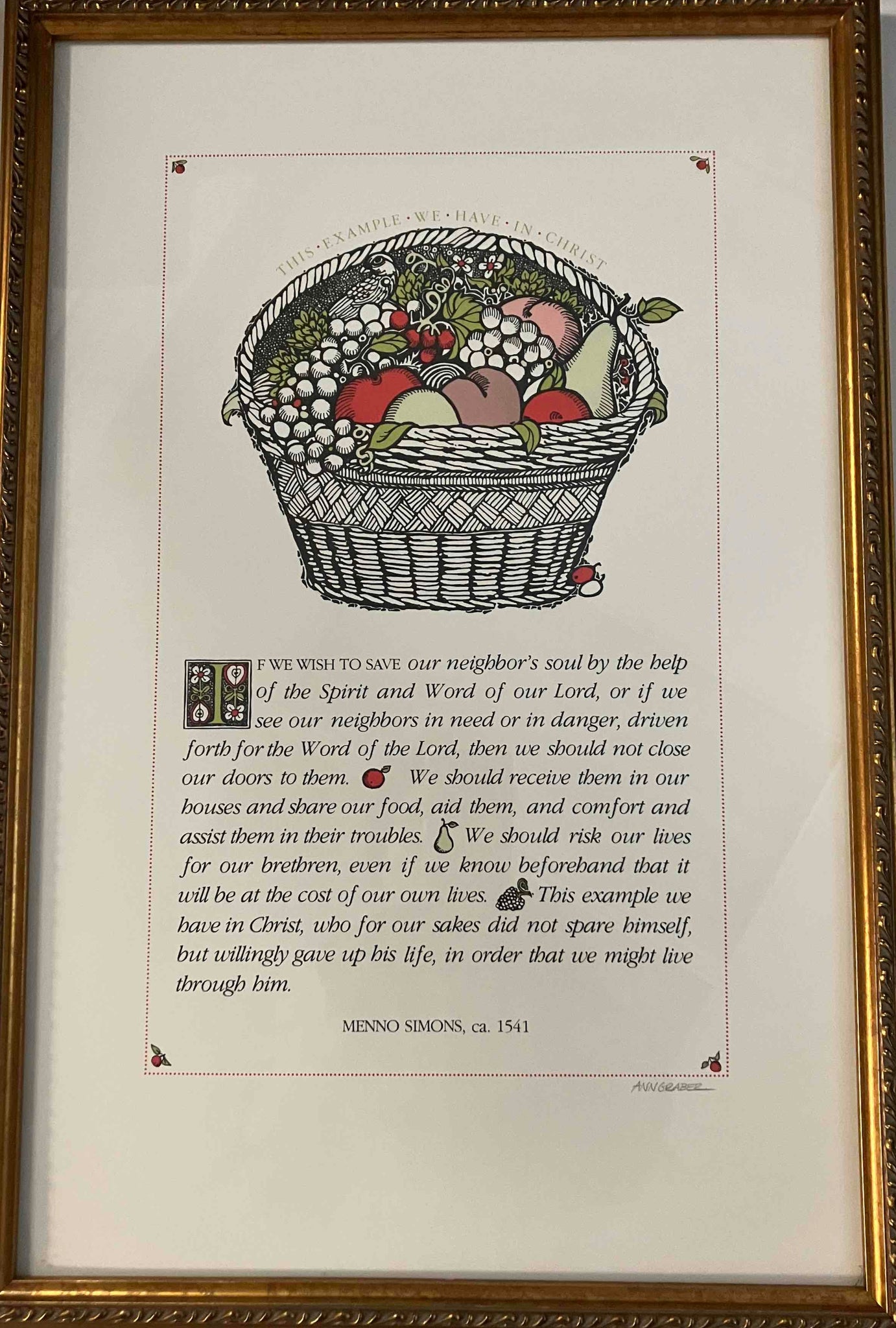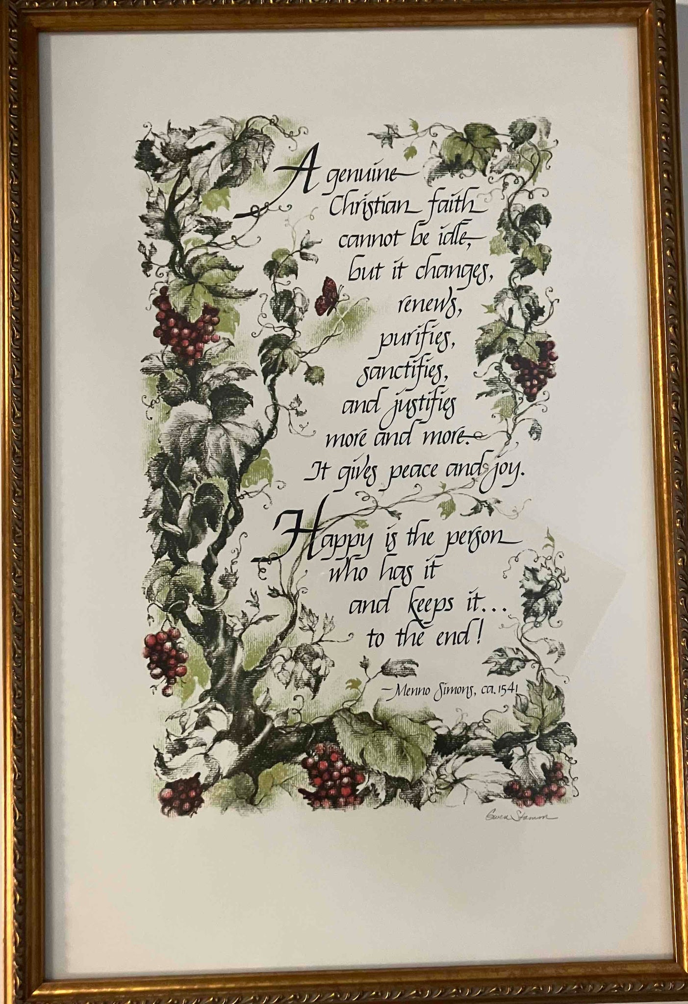 The collection of 3 of the 4 framed prints interprets Menno Simons words through artistic medium unique three artists: Gwen Stamm, Jan Gleysteen and Ann Graber.