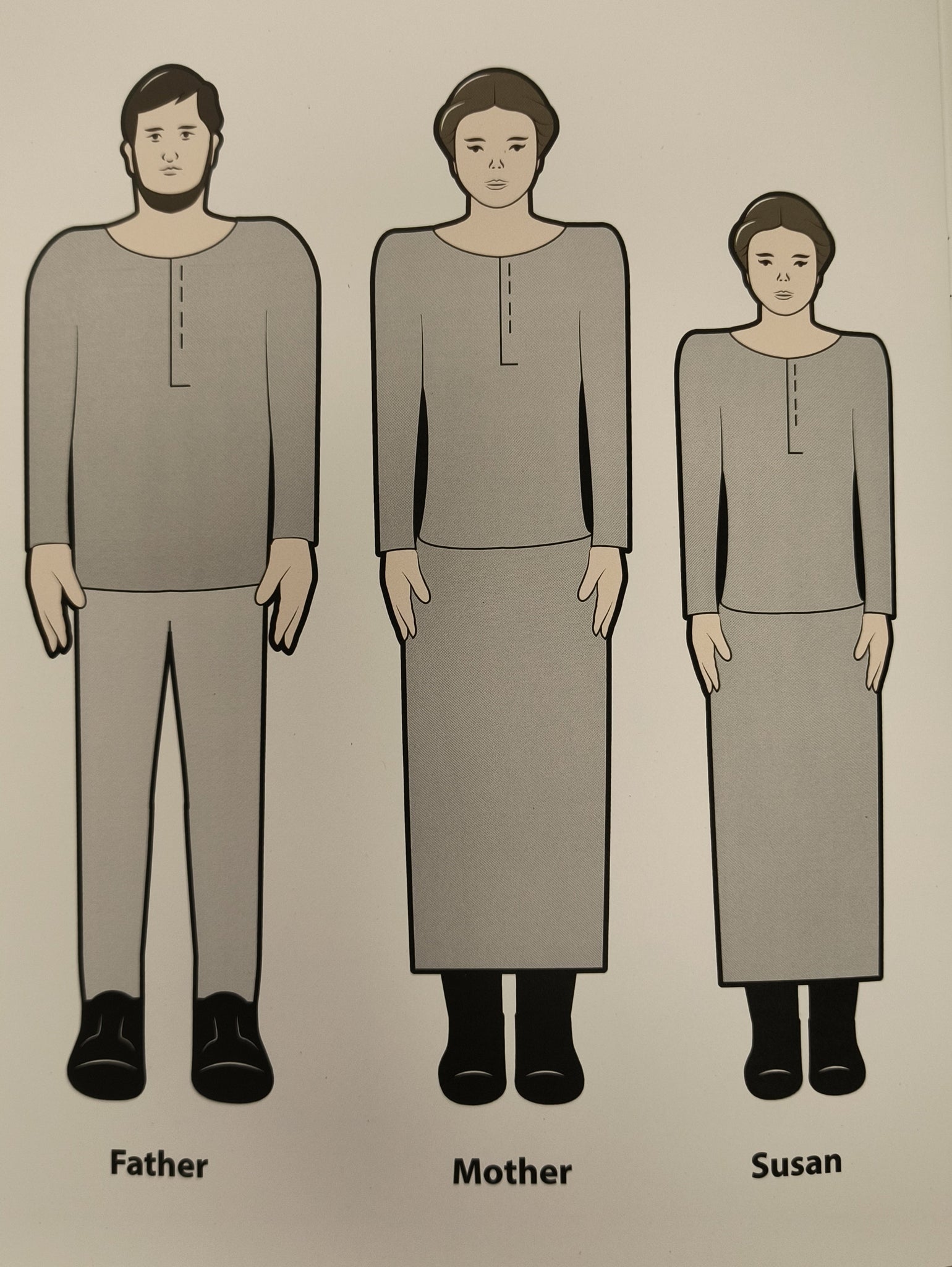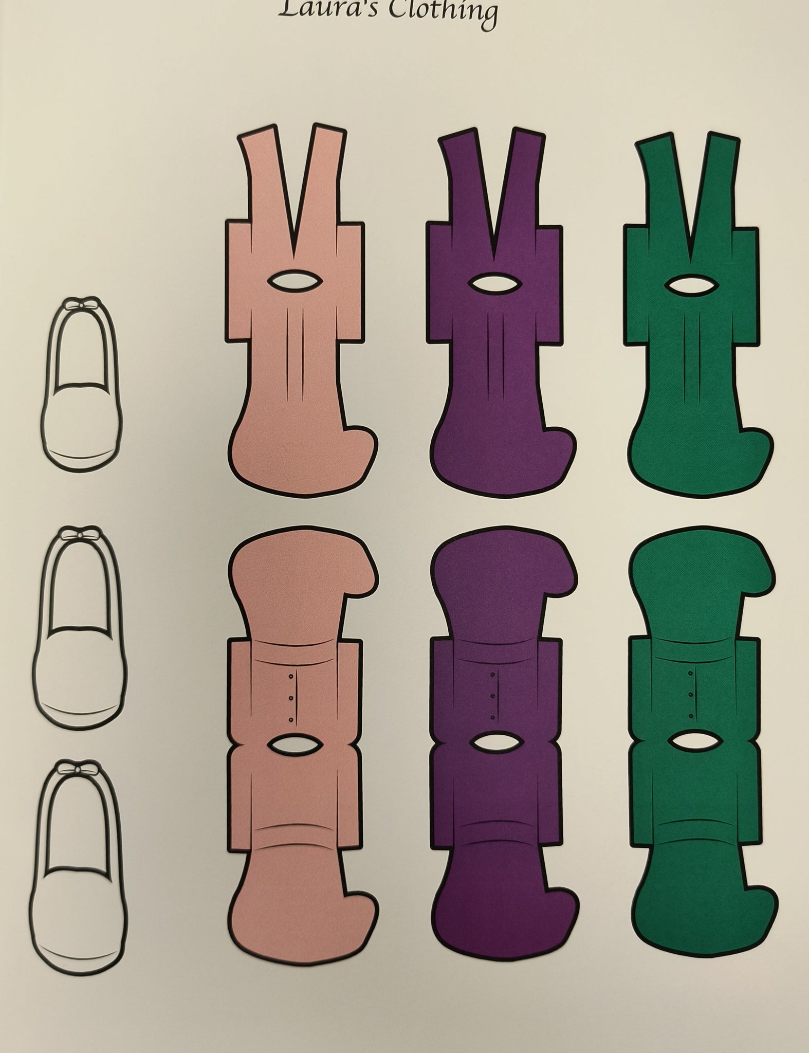 Directions: Remove the staples from this book and separate all the pages. With a scissors carefully trim out the dolls and the clothing. Cut out the neck far enough so the head will slip through, or make a small slit down the front. You can also use the clothing in this book for a pattern to make other paper clothes for your dolls. Always fold in half to get your front and back.