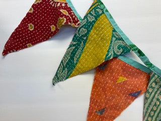 This garland is topped by a green print fabric that is 8' long. It has 10 flags that are 8" l x 6" w. Flags have raw edges.